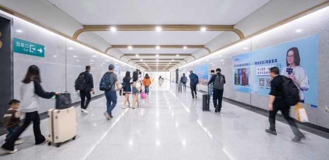惠州南站出站通道兩側墻面燈箱廣告7塊大型燈箱沿通道兩側分布,套裝組合發(fā)布既可在有限預算內實現(xiàn)重點覆蓋,也可通過多組采購形成更密集的展示陣列,增強了品牌形象的展示氣勢。墻面燈箱在通道環(huán)境中具有視覺上的突出性,較大的展示面積確保了廣告內容在有效距離內的清晰辨識。這種連續(xù)設置的燈箱組能夠在旅客出站過程中形成持續(xù)的視覺引導,使品牌信息得以在相對封閉的通道空間內實現(xiàn)有效傳遞。