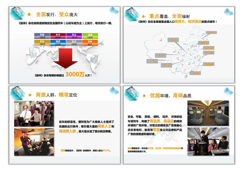 四、商旅人群,精確鎖定;高速鐵路的便利性、舒適性、良好的列車服務(wù)以及覆蓋的高密度,為商務(wù)人士提供了足以媲美甚至超越民航客機的出行條件,吸引著大量的商務(wù)人士和高消費人群。