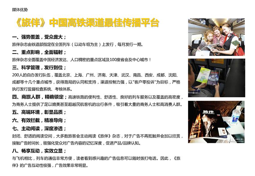 《旅伴》由鐵道部主管,中國鐵道出版社出版,被指定在全國動車組及直達列車車站擺放的商旅人文類高端雜志,旅伴每月發(fā)行一期,每期發(fā)行35萬冊,月覆蓋人群3000萬,是目前全國覆蓋范圍最廣,受眾數(shù)量最多經(jīng)營最好的渠道媒體。