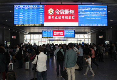 媒體位置:候車大廳中央通道LED屏 媒體編號(hào):SZN-L-(01-04) 媒體尺寸:3.3m*2.26m 媒體數(shù)量:4塊 媒體報(bào)價(jià):25萬元/月/5秒,45萬元/月/10秒,60萬元/月/15秒