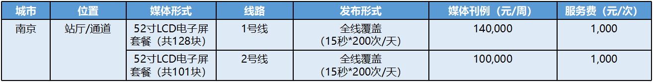 1、2號線電子媒體目前主要以LCD媒體為主,媒體位置多處于站定和通道,具體價格信息如下圖所示