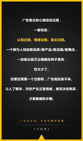 廣告受眾的心理活動過程,一般包括:認(rèn)知過程、情緒過程、意志過程。一個鮮為人知的新品牌/新產(chǎn)品/新店鋪/新概念,一經(jīng)推出就萬眾擁戴的例子是有,但太少了。戀愛還需要一個過程呢,廣告真的急不來。讓人了解你,對你產(chǎn)生正面情感,繼而決定購買,才是穩(wěn)健的步驟。