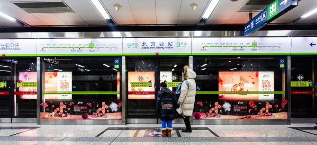 北京地鐵屏蔽門貼以及站臺(tái)軌行區(qū)聯(lián)排燈箱廣告,以透明玻璃貼和發(fā)光燈箱的廣告形式在站臺(tái)層展現(xiàn)連貫畫面內(nèi)容,廣告存在感強(qiáng)、到達(dá)率高,具有直觀有效的宣傳效果。
