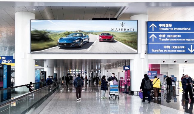 T3國(guó)內(nèi)出發(fā)A區(qū)、B區(qū)安檢正上方:2面LED大屏,尺寸34.4m×5.1m,100%覆蓋T3國(guó)內(nèi)國(guó)際出發(fā)乘客,提供極致視覺(jué)效果。