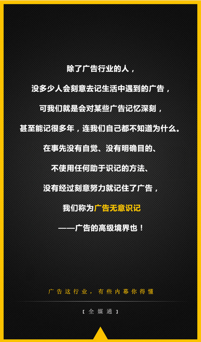 除了廣告行業(yè)的人,沒多少人會刻意去記生活中遇到的廣告,可我們就是會對某些廣告記憶深刻,甚至能記很多年,連我們自己都不知道為什么。在事先沒有自覺、沒有明確目的、不使用任何助于識記的方法、沒有經(jīng)過刻意努力就記住了廣告,我們稱為廣告無意識記——廣告的高級境界也!
