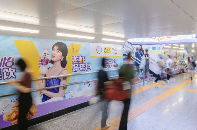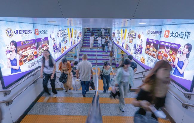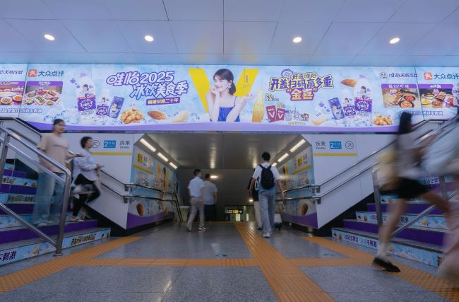 長沙地鐵萬家麗廣場站換乘品牌通道廣告覆蓋2號線轉(zhuǎn)5號線、5號線轉(zhuǎn)2號線雙向客流。2塊梯眉燈箱位于樓梯正上方,乘客仰視上下樓梯時視線自然鎖定,單次閱讀時長 5-8秒;55㎡雙側(cè)墻面貼形成“視覺長廊”,雙邊樓梯立面貼沉浸覆蓋,乘客步行通過全程持續(xù)接觸廣告,總曝光時長 40-60秒/人次。立體視覺包圍、動線無遺漏觸達(dá)、場景化閉環(huán)轉(zhuǎn)化等優(yōu)勢在乘客消費決策關(guān)鍵節(jié)點實現(xiàn)深度滲透。“必經(jīng)過道+商圈直連”屬性特別適合快消、零售、文旅及本地生活品牌。