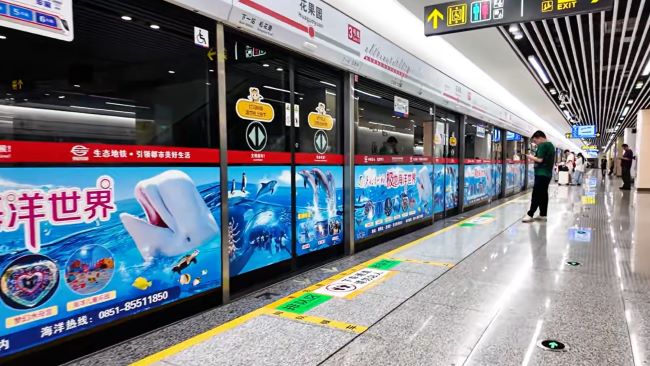 貴陽地鐵站臺層是一個相對封閉的空間,環(huán)境干擾信息少。屏蔽門作為乘客上下車的唯一通道,其廣告位置天然成為視覺焦點。這種環(huán)境使得廣告觸達效率極高,記憶效果優(yōu)于開放環(huán)境。廣告位于屏蔽門底部,閱讀距離僅0.5-1米。乘客在候車時,目光會多次掃視屏蔽門以確認列車信息,單人次可實現(xiàn)多次廣告接觸,記憶留存率顯著提升。高透的玻璃貼材質(zhì)不影響站臺采光和乘客觀察列車,與地鐵導視系統(tǒng)自然融合,降低乘客的排斥感。