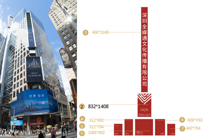 投放位置:路透社 媒體報價:咨詢第一戶外 共有7塊不同尺寸的廣告屏幕,整體約22層樓高,約76米。 (單位:像素;格式:圖片jpg、視頻mp4) |