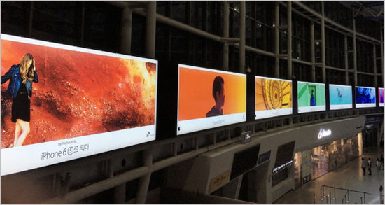 7月,蘋果公司又開始了新一輪的廣告轟炸,這一次主題名為 “Colors(色彩)”,仍然以用iPhone手機拍攝的照片為廣告畫面,不同的是,這次的廣告投放多以燈箱、大牌為主,而且聯(lián)裝燈箱一發(fā)就是一大串,赤橙黃綠青藍紫亮成一道彩虹。
