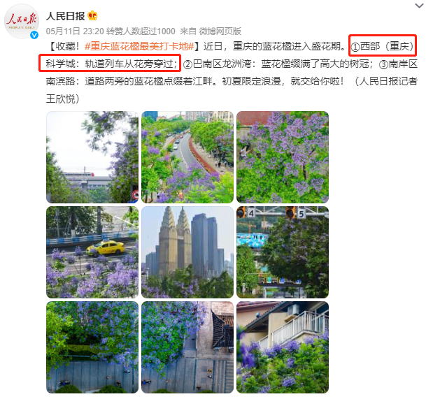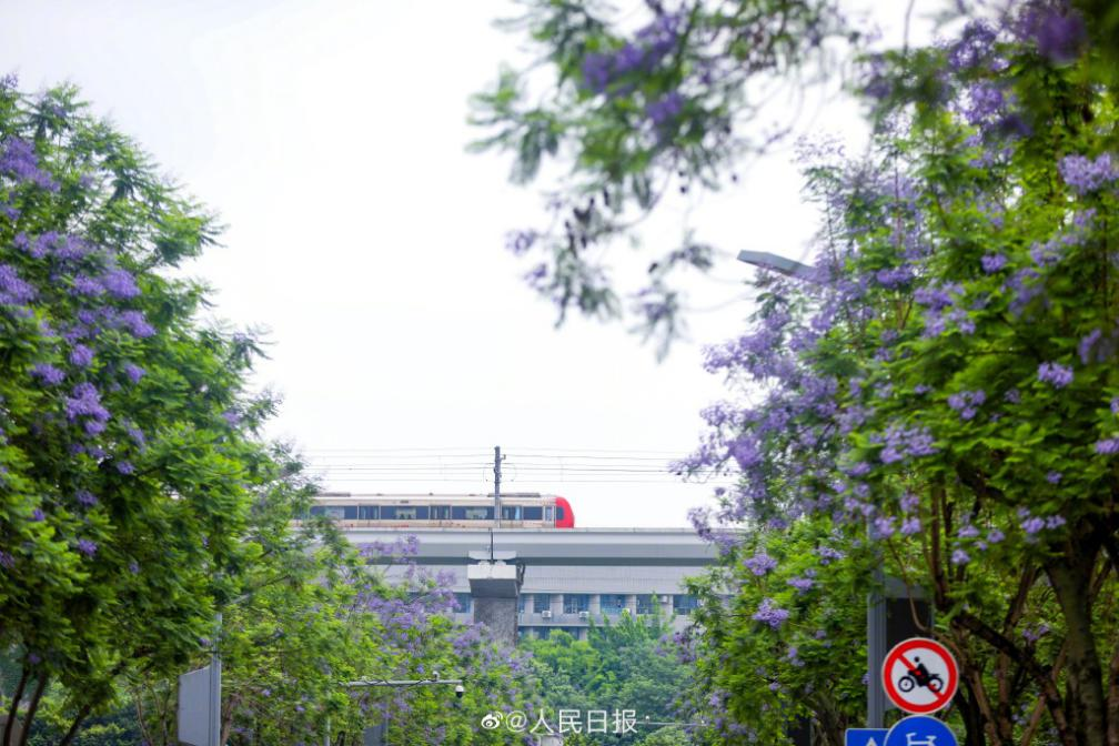 近日,人民日報(bào)等藍(lán)V官方推薦的重慶藍(lán)花楹最美打卡地點(diǎn)旅游攻略,居于榜首的就是重慶地鐵1號線的地上段,這張花叢中穿行而過的重慶地鐵廣告也隨著藍(lán)花楹美圖刷爆全網(wǎng)。