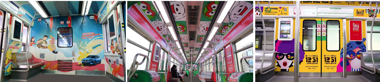 覆蓋范圍廣。重慶輕軌擁有多條線路,覆蓋了城市不同區(qū)域和景點(diǎn),能夠?yàn)閺V告主提供更廣闊、更具針對性的廣告?zhèn)鞑テ脚_。地鐵內(nèi)外設(shè)施不同,常規(guī)標(biāo)準(zhǔn)化車身內(nèi)外空間可以滿足各種形式的廣告需求。