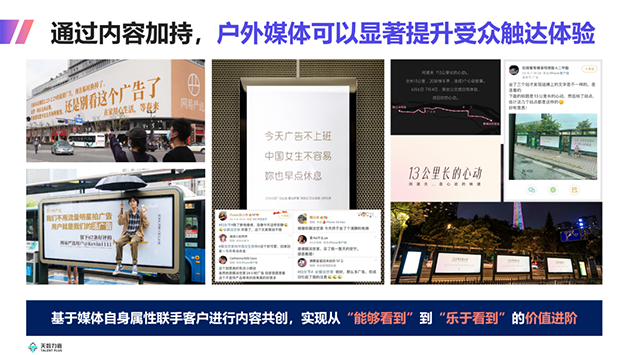 消費者在傳播中的地位增強,推動戶外媒體角色升級:從展示和放大信息的單向媒介,升級為用戶與品牌情感溝通的【交互通道】。通過內(nèi)容加持,戶外媒體可以顯著提升受眾觸達(dá)體驗;借助戶外場景,釋放內(nèi)容能量,也能讓傳播更加深入人心。