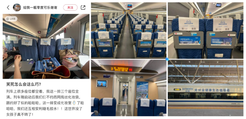 高鐵列車上三連座的三位陌生人同時(shí)掏出化妝包鋪滿高鐵小桌板,默契行為被博主拍照發(fā)布到小紅書。創(chuàng)維光伏的高鐵列車頭枕巾廣告、高鐵列車行李架彩貼廣告也一同出鏡,形成二次傳播。