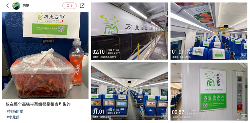 媽媽給打包的巨盒小龍蝦高鐵便當(dāng)也讓這位旅客激情分享至小紅書,縣農(nóng)業(yè)農(nóng)村委、農(nóng)高集團(tuán)冠名高鐵列車廣告也一同出鏡,高鐵列車頭枕巾廣告與展現(xiàn)的二維碼一起清晰地呈現(xiàn)在網(wǎng)友面前。又是一次成功的高鐵廣告二次傳播案例。