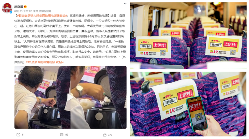 無獨(dú)有偶,電飯煲上高鐵也沖上熱搜高位,跟隨電飯煲一同入鏡的伊對(duì)APP高鐵列車頭枕巾廣告以其黃粉撞色的廣告畫面,與和諧號(hào)高鐵列車的藍(lán)紫色座椅形成強(qiáng)烈視覺沖擊,除了畫面C位的電飯煲,伊對(duì)APP高鐵廣告也隨社會(huì)熱點(diǎn)事件一起被新聞媒體全網(wǎng)刷屏。