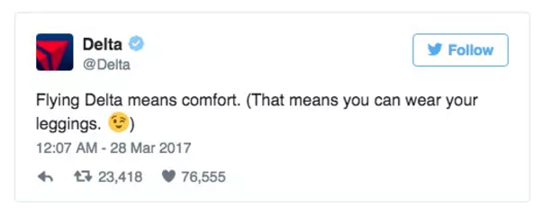 競(jìng)爭(zhēng)對(duì)手達(dá)美航空(Delta Airlines)立刻跳出來(lái)諷刺美聯(lián)航:在我們這兒大家可以穿Leggings,我們就是要讓大家飛得舒服!