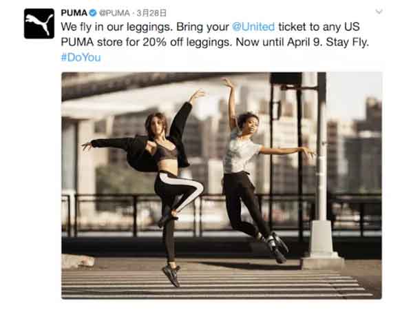 也有直接而粗暴的營(yíng)銷(xiāo),比如彪馬(Puma)——拿著美聯(lián)航的機(jī)票到任意一家美國(guó)Puma店買(mǎi)Leggings,就可享受20%的折扣!