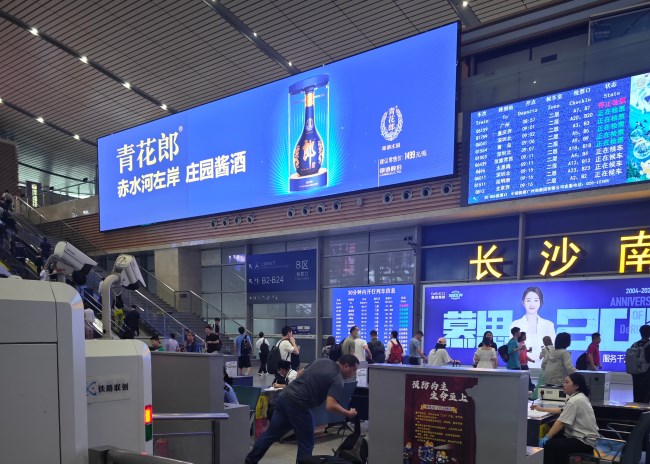 長沙南站進站大廳安檢口上方LED巨屏廣告位于高鐵長沙南站人流量最集中的西安檢大廳中央正上方位置,100%覆蓋出發(fā)旅客。大屏橫長22米的地標廣告巨屏橫跨進站口,兩塊超百平巨型廣告位全天候高頻同步輪播,廣告位位于列車時刻表左右兩側(cè),廣告位明亮醒目,無遮擋可視范圍廣視野良好,存在感極強。此大屏廣告位經(jīng)常隨旅客打卡照片刷屏社交媒體,屬于長沙南高鐵站地標廣告位。