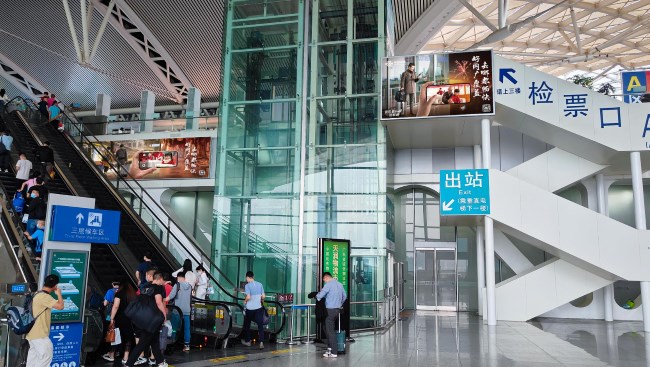 廣州南站出發(fā)層?xùn)|落客進(jìn)站大廳電梯兩側(cè)落地?zé)粝?/span>廣告