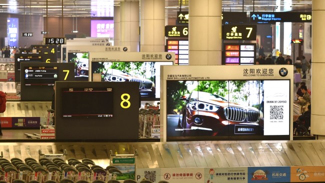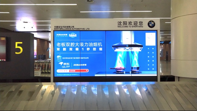 沈陽機(jī)場(chǎng)國(guó)內(nèi)國(guó)際到達(dá)行李轉(zhuǎn)盤上方ADF大屏廣告