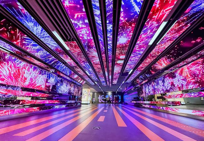 長沙地五一廣場站彩云通道LED大屏廣告位于五一廣場站3A通道拐角,采用鏡面+LED雙材料融合打造,條形屏幕立體式環(huán)繞的一條巨型數(shù)字隧道,頗具夢幻效果。并結合長沙核心地段的位置優(yōu)勢,打造異形LED“長沙”主題字互動打卡區(qū),大屏環(huán)繞分布整體媒體空間沉浸感強,充滿觀看性、打卡性和互動性,吸引市民與游客合影上傳社交媒體,更具傳播性。