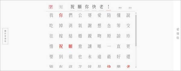 16. 唯一的缺點是“留言就送手寫情書”的活動只能通過Facebook參加,(臺灣不懂大陸的傷悲,就像白天不懂夜的黑)。至于廣告片、《愛情收》情書展、軟文推廣之類的手段沒什么可說的,倒是“愛情體定制巧克力”讓人眼前一亮——用戶在網(wǎng)上自己選定文字,華康字型制作并送到戀人手中。