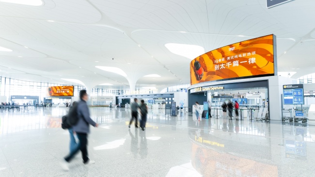 杭州機(jī)場(chǎng)T3安檢口正上方LED屏廣告,垂直覆蓋旅客排隊(duì)等候區(qū),T4航站樓弧形屏精準(zhǔn)匹配國(guó)際/國(guó)內(nèi)雙流線,利用弧形曲面實(shí)現(xiàn)160°廣角覆蓋,同步觸達(dá)辦票、行李托運(yùn)及安檢預(yù)備人群。