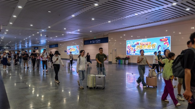 長沙南站出站通道兩側(cè)墻面燈箱廣告10余塊組燈箱連續(xù)排布形成30米品牌墻,視覺沖擊力較單燈箱提升400%。通道寬度有限,客流密度峰值達5人/㎡,旅客視線無回避空間,燈箱注目率超85%;高鐵密集到站時段通道客流密度激增,通道墻面燈箱高位懸掛設(shè)計突破人群遮擋,可視率保持95%;長沙南站到達區(qū)域解除行程壓力后旅客信息接收意愿提升60%,廣告記憶留存率顯著高于進站場景。