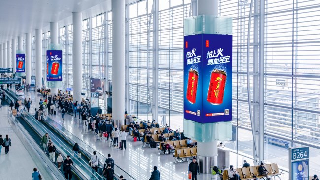 廣州機(jī)場(chǎng)T2國(guó)內(nèi)出發(fā)到達(dá)混流區(qū)巨型包柱套裝廣告每根包柱套裝由4個(gè)廣告面環(huán)繞組成,形成完整的360度展示。無(wú)論旅客從哪個(gè)方向行走或停留,視線都無(wú)法避開(kāi)廣告信息,包柱廣告于候機(jī)區(qū)座椅旁,正對(duì)旅客視線。單柱廣告面積達(dá)56.64㎡,三套組合形成總計(jì)約170㎡的連貫展示群。在開(kāi)闊的機(jī)場(chǎng)空間內(nèi),這種“頂天立地”的垂直巨幅展示形態(tài),具有天然的視覺(jué)存在感和沖擊力,能有效吸引注意力并承載清晰的品牌形象和核心信息。
