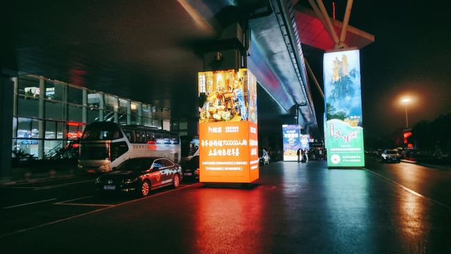張家界機(jī)場(chǎng)航站樓出口門廊包柱燈箱廣告同時(shí)覆蓋到達(dá)機(jī)場(chǎng)的旅客以及接機(jī)人群,6根立柱在兩條行車道中間形成一道強(qiáng)大的視覺(jué)矩陣。無(wú)論旅客和接機(jī)人員從哪個(gè)方向走來(lái),或是車輛從哪個(gè)車道駛?cè)?,都無(wú)法避開(kāi)廣告畫面的包圍,實(shí)現(xiàn)了真正意義上的全景式無(wú)遺漏觸達(dá)。多根立柱聯(lián)排展示,其規(guī)?;囊曈X(jué)延伸效應(yīng)遠(yuǎn)勝于單根立柱。4.6米的高度在戶外環(huán)境中形成強(qiáng)烈的視覺(jué)統(tǒng)治力,結(jié)合無(wú)邊框全景燈箱的設(shè)計(jì),畫面整體感和視覺(jué)沖擊力非常突出,能第一時(shí)間抓住所有人的注意力。