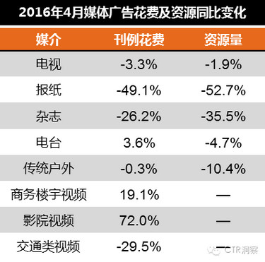 CTR市場(chǎng)研究媒介智訊最新研究數(shù)據(jù)顯示,2016年4月廣告市場(chǎng)(不含互聯(lián)網(wǎng))同比下降4.9%。其中,傳統(tǒng)媒體同比下降6.9%。