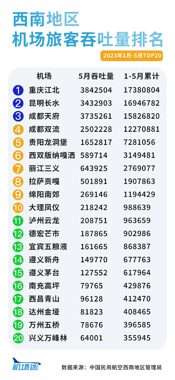 西南地區(qū)機(jī)場(chǎng)廣告2023年1-5月旅客吞吐量排名,重慶機(jī)場(chǎng)廣告旅客吞吐量居首位
