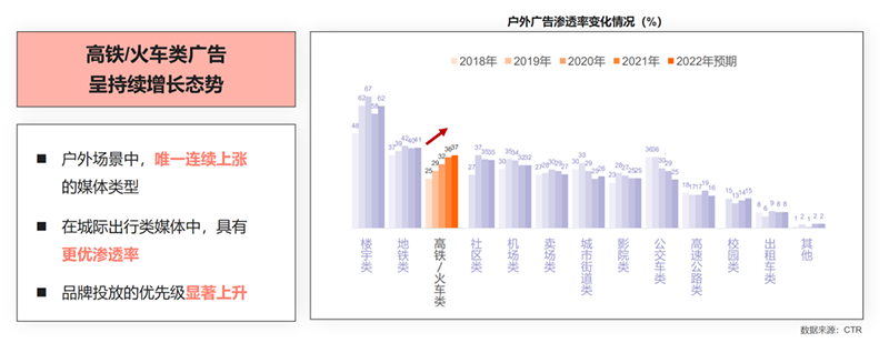 根據(jù)CTR數(shù)據(jù),高鐵火車站廣告近年來是唯一呈現(xiàn)連續(xù)增長態(tài)勢的媒體,側(cè)面佐證了高鐵平臺為品牌傳播賦能增勢的價值越來越受品牌主認(rèn)可。