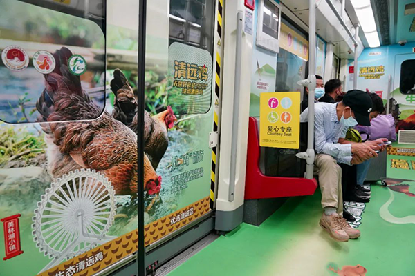 專(zhuān)列車(chē)廂整體以青綠色為主調(diào),列車(chē)兩側(cè)車(chē)門(mén)、地板等配以清遠(yuǎn)雞卡通IP形象與實(shí)物圖片,十分討喜。