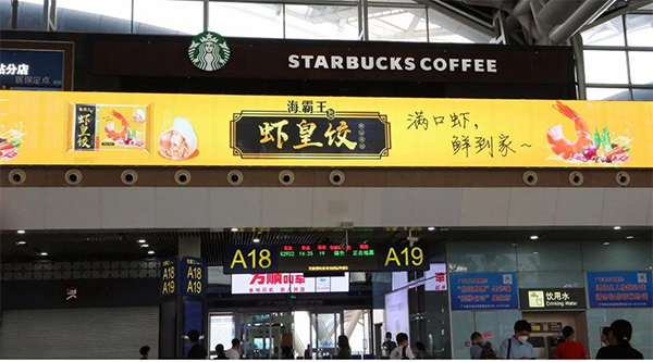 旅客們一進(jìn)檢票口就可以看到海霸王蝦皇餃廣告