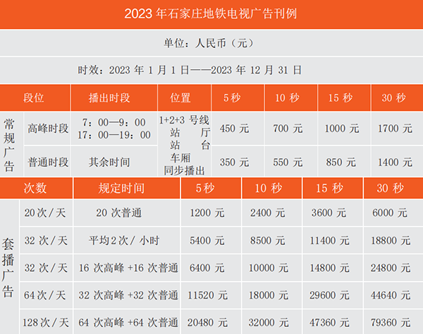 實際執(zhí)行價格根據(jù)投放量決定相應(yīng)折扣,石家莊地鐵電視廣告折扣價格歡迎咨詢第一戶外。