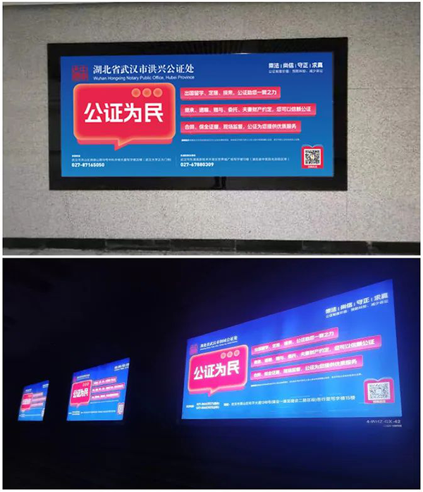 以“公證為民”為主題的燈箱廣告正式亮相武漢地鐵各大站點(diǎn),武漢市8家市屬公證機(jī)構(gòu)在各大站點(diǎn)集中展示公證服務(wù),營(yíng)造濃厚的公共法律服務(wù)宣傳氛圍,讓老百姓切實(shí)感受到了公證服務(wù)就在身邊。