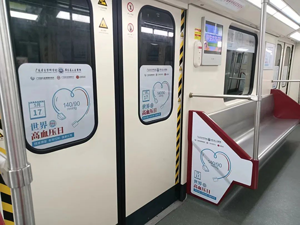 在5月17日世界高血壓日來臨之際,廣東省心血管病中心在廣州地鐵1號線列車車廂內(nèi)投放公益廣告宣傳,并有10塊燈箱分別在烈士陵園、體育西等10個站點進行廣告宣傳。