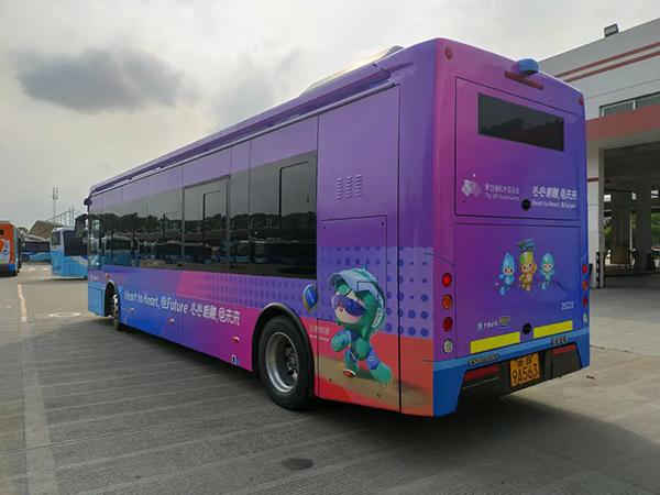 淺藍(lán)、紫紅等明亮色塊的亞運(yùn)主題設(shè)計(jì)的46條主要線路寧波公交車身廣告亮相甬城街頭,充滿亞運(yùn)元素的車身廣告外觀設(shè)計(jì)讓市民眼前一亮,這些公交車車身圖案印有活潑的亞運(yùn)吉祥物,圖案中還有“心心相印@未來”的字樣,既活潑應(yīng)景又充滿寧波地域特色。