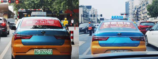 后視窗廣告帶來(lái)極強(qiáng)的視覺(jué)沖擊力和吸引力。義烏出租車后窗貼廣告的高度位置正好與司機(jī)、行人視線持平,且位于司機(jī)的正前方,垂直于視線,觀看視角絕佳,可以將廣告信息近距高地傳播給受眾,達(dá)到最大的可視機(jī)會(huì)。