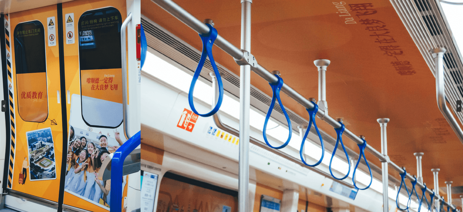 全仔今天帶來的佛山地鐵3號線內(nèi)包車廣告案例來自佛山市順德區(qū)大良街道‘水韻鳳城 品質(zhì)大良’主題列車,本次佛山地鐵主題列車廣告通過地鐵包天包地6節(jié)車廂,用最亮眼的橘黃色海報向乘客講述大良特色美食、旅游、教育等元素。除了經(jīng)典的清暉園、雙皮奶、鐘樓等知名項目,還有順峰山公園長鹿農(nóng)莊等景點等待乘客與市民朋友探索。歡迎搭乘佛山地鐵3號線大良主題列車來順德大良!