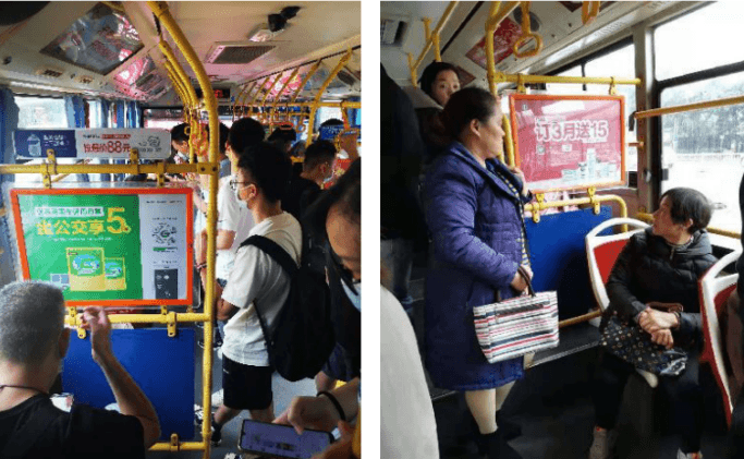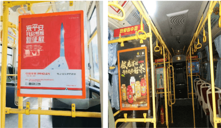 媒體位置:公交車內(nèi)車廂的前中后部,3個位置共計6面廣告