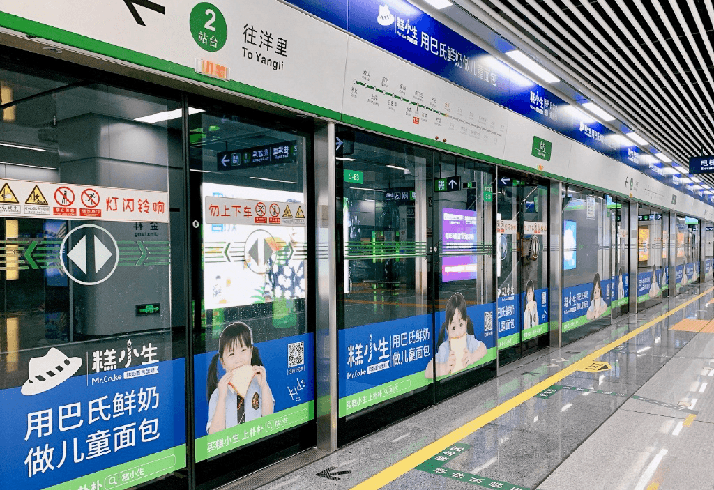 福州地鐵2號(hào)線金祥站是A++級(jí)別站點(diǎn),緊鄰S+級(jí)別2號(hào)線和5號(hào)線換乘站的金山廣場(chǎng)站,周邊分布有政府辦公區(qū)、金山中學(xué)、榕城廣場(chǎng)、金山體育場(chǎng)以及若干高端住宅區(qū),屬于福州核心區(qū)域,客流量大。糕小生選擇此站點(diǎn)投放站臺(tái)屏蔽門(mén)廣告,覆蓋的廣告受眾不僅包含周邊大片高端住宅區(qū)通勤的居民、學(xué)生以及學(xué)生家長(zhǎng),也包含前往公園、江邊等景區(qū)游樂(lè)場(chǎng)所的游客。廣告畫(huà)面以醒目的藍(lán)色為底色,突出吃面包的可愛(ài)小朋友與鮮奶吐司,搭配2號(hào)線的綠色圖標(biāo),使效果更加醒目。