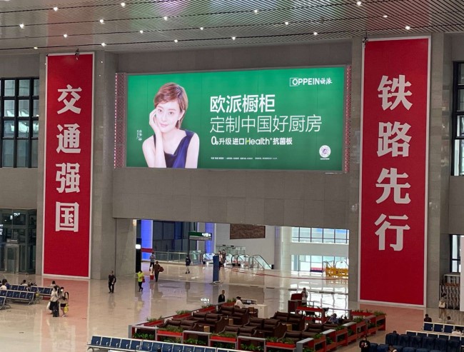 重慶北站候車大廳巨幅燈箱廣告位于離地近10米的站棚墻面,視野良好可視范圍廣。巨型燈箱廣告橫長(zhǎng)超18米,高8米,且位于商務(wù)車廂候車區(qū)上方,廣告存在感極強(qiáng)。北站地標(biāo)性廣告位更能提升品牌吸引力和公信力,彰顯品牌高端調(diào)性,對(duì)品牌傳播影響深遠(yuǎn),是政企宣傳的重要窗口。