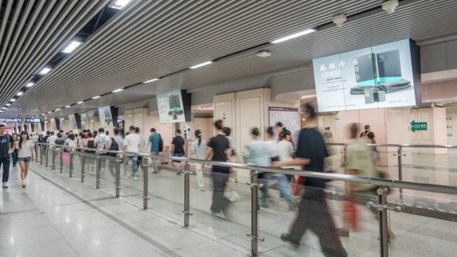 武漢地鐵江漢路站2號(hào)線與6號(hào)線換乘區(qū)域通道LED大屏套裝廣告全面覆蓋密集的換乘客流,屬于地處黃金位置的動(dòng)態(tài)廣告形式。大屏廣告與地鐵墻面等高,呈現(xiàn)頂天立地的視覺(jué)效果。大屏廣告動(dòng)態(tài)畫面自體發(fā)光更加吸睛,在換乘通道內(nèi)亦充當(dāng)照明設(shè)備,廣告存在感極強(qiáng),畫面更具沖擊力。11組LCD廣告屏橫跨整個(gè)換乘通道,位于乘客視線上方如影隨形。