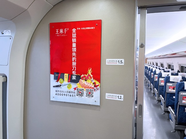 王麻子號(hào)高鐵專列廣告,借助高鐵列車廣告“巨大流量、精準(zhǔn)傳播、深度覆蓋、高頻曝光”等優(yōu)勢(shì),通過(guò)外車身貼、車廂海報(bào)、頭枕巾、小桌板、車門貼、行禮架、LED屏、語(yǔ)音播報(bào)等多元化的媒體形式,打造沉浸式的品牌傳播場(chǎng)景,讓高鐵專列變身為全方位、立體化展現(xiàn)王麻子廚具品牌形象的“移動(dòng)長(zhǎng)廊”。