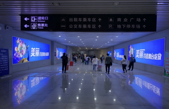 媒體優(yōu)勢(shì):位于賀州站出站通道兩側(cè)墻體,均為靠近閘機(jī)口的黃金廣告位。橫長(zhǎng)超8米超大燈箱廣告牌脫穎而出醒目吸睛。