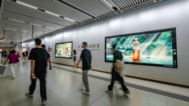 武漢地鐵2號線循禮門站站廳廣告由墻貼、燈箱等元素構(gòu)成,同時覆蓋進(jìn)站以及出站的密集客流。巨大的墻貼以及呈現(xiàn)發(fā)光效果的燈箱等廣告形式在循禮門站與眾不同的站廳換乘區(qū)域形成巨大的品牌空間,連續(xù)的品牌長墻可承載更豐富的內(nèi)容,超長時間吸引往來乘客注意力,以超高的存在感搶占客流視線,形成品牌記憶。
