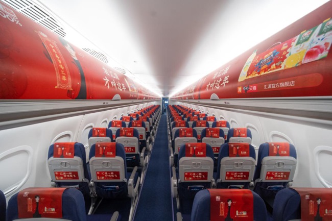 華夏航空飛機客艙內(nèi)行李架彩貼頭枕巾小桌板貼三件套廣告