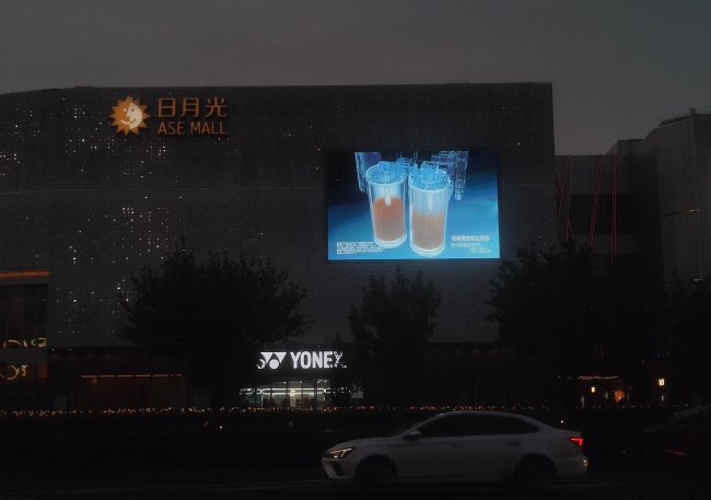 上海寶山日月光外墻LED大屏廣告橫長超18米,高度11.3米,總面積達203.6㎡超大屏體形成500米超視距傳播半徑,結(jié)合十字路口車流緩行區(qū),實現(xiàn)“移動+靜止”雙態(tài)曝光:車輛低速通過時接觸時長8-12秒/次,行人過街時平均注目頻次達2.3次。夜間利用建筑泛光照明系統(tǒng)聯(lián)動,使廣告畫面與商業(yè)體燈光氛圍融合,提升品牌信息的情感滲透力。